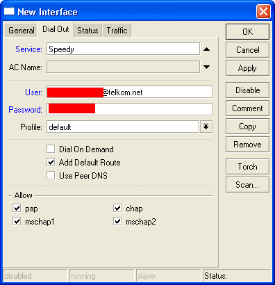 sekarang setting pppoe-client, kita akan dialing speedy melalui mikrotik